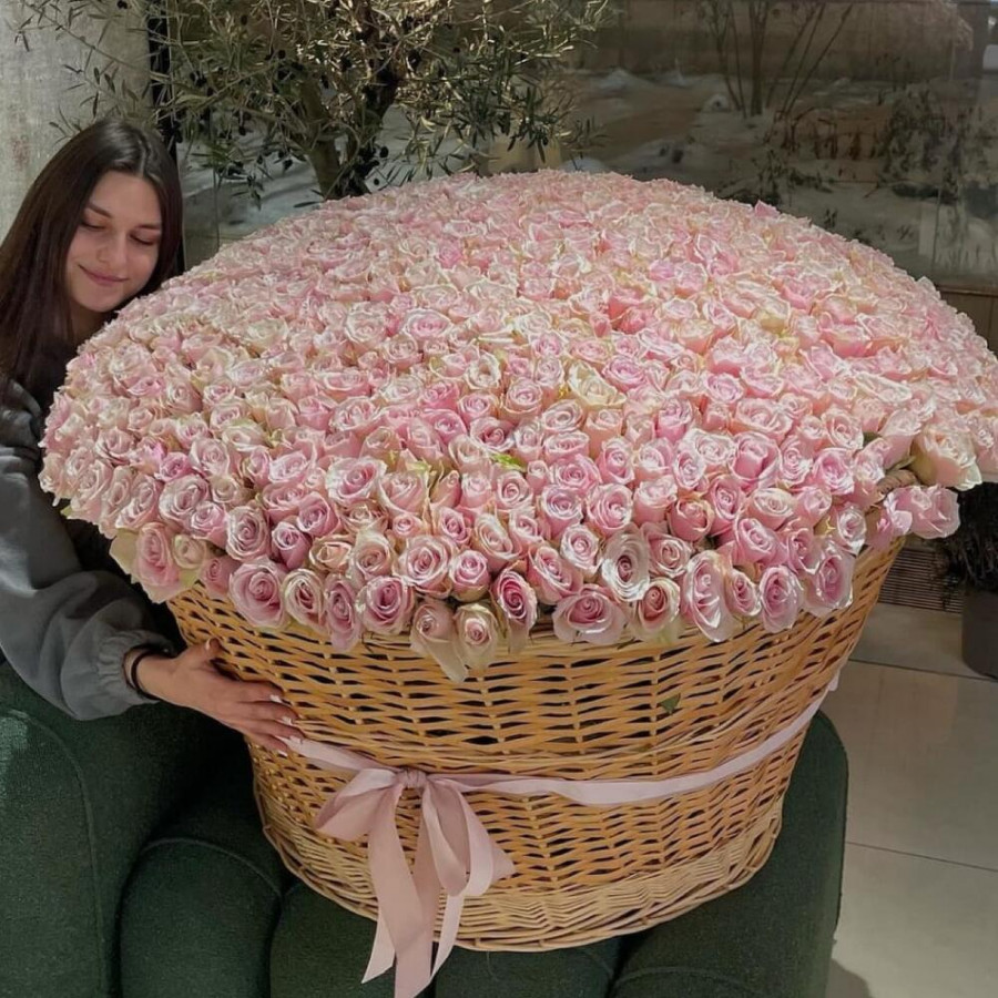 На фото 1001 розовая роза в корзине «чудо». В составе: роза 1001 шт, корзина (xl) 1 шт, оазис флористический 22 шт, . Все цветы свежие и ароматные, букет красиво оформлен и отлично подходит для подарка. Доступна доставка цветов или самовывоз.