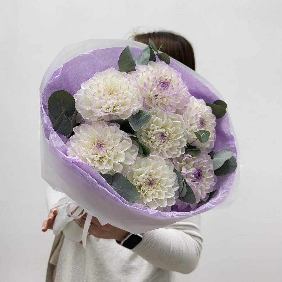 Букет из 7 бело-лиловых георгин с эвкалиптом в Тюмени