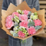 На фото букет из белой эустомы и розовых гвоздик. В составе: эустома (лизиантус) 4 шт, гвоздика 9 шт, эвкалипт 4 шт, крафт-бумага 1 шт, атласная лента 1 шт, . Все цветы свежие и ароматные, букет красиво оформлен и отлично подходит для подарка. Доступна доставка цветов или самовывоз.