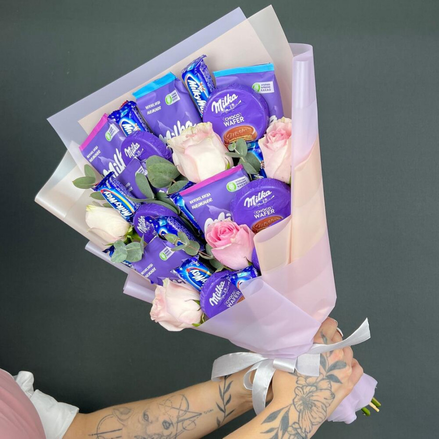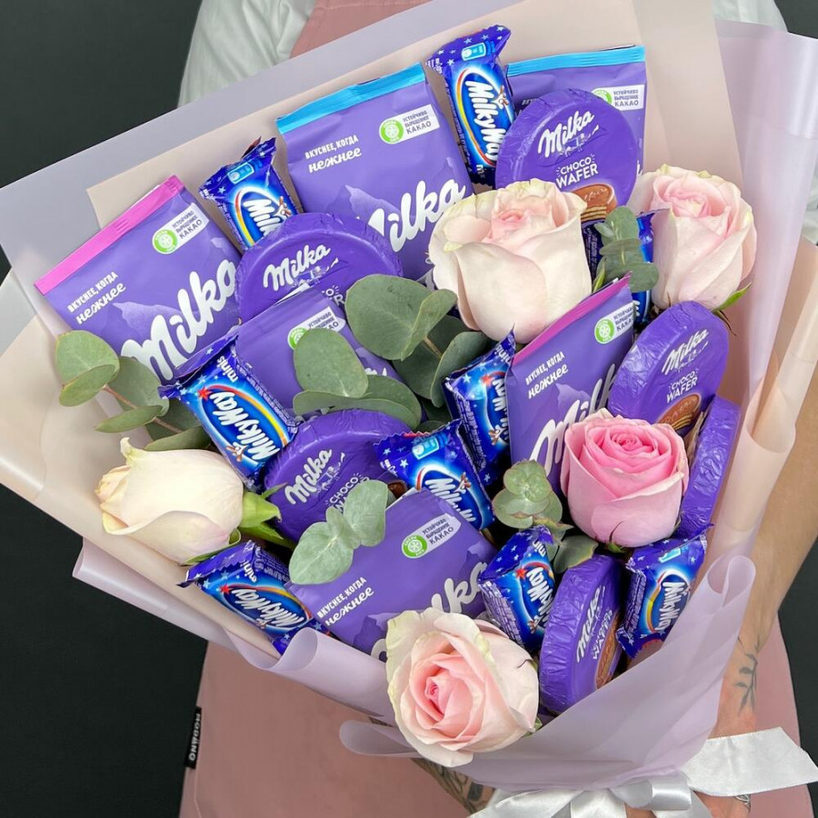 Роза одноголовая - 5 шт. Лента атласная - 1 шт. бумага дизайнерская - 6 шт. конфеты милки вей - 8 шт. конфеты milka плитка - 6 шт. конфеты milka медальки - 5 шт.